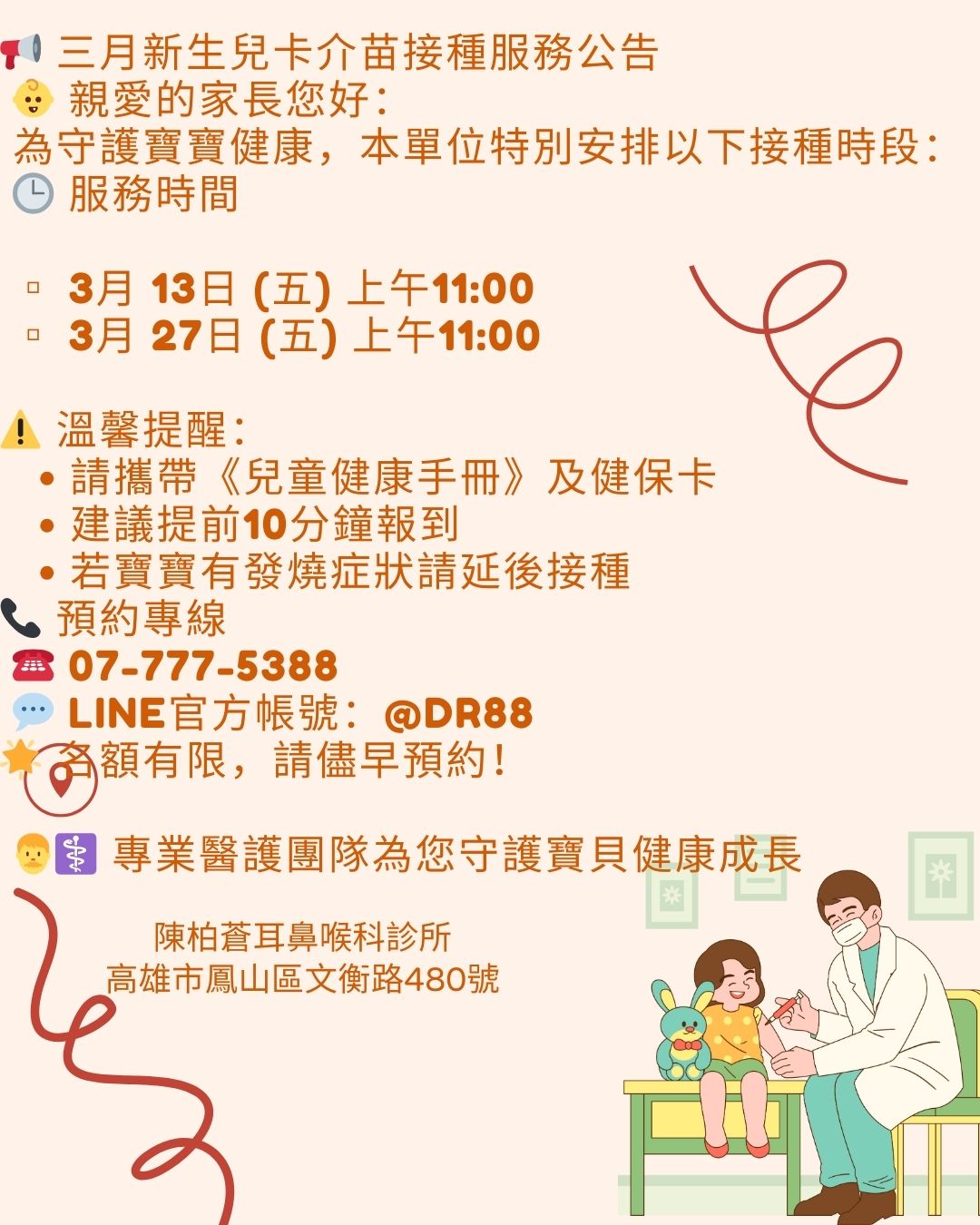 三月份寶寶卡介苗接種服務時間為3月13及3月27日早上11點,歡迎來電預約!